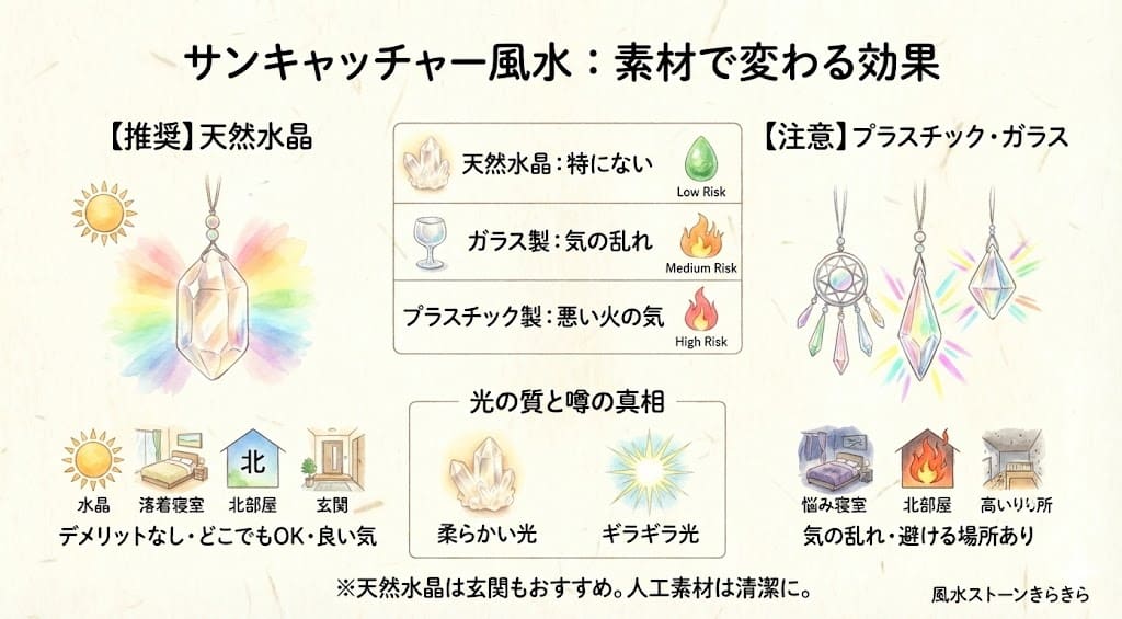 サンキャッチャーには、素材によって風水的なデメリットがあります。プラスチック製やガラス製は注意が必要ですが、天然水晶にはデメリットがほとんどありません。