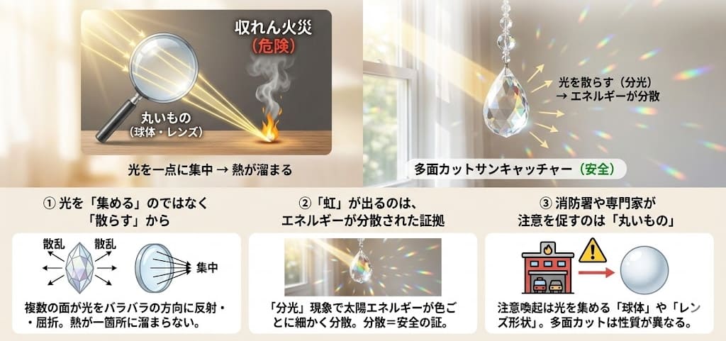 サンキャッチャーによる火災リスクは、光を一点に集めない「多面カット」の形状を選べば極めて低くなります。
