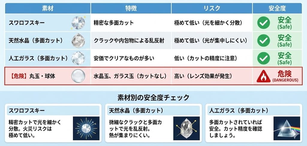 サンキャッチャーの火災リスクにおいて最も重要なのは、素材の種類ではなく「形状」です。