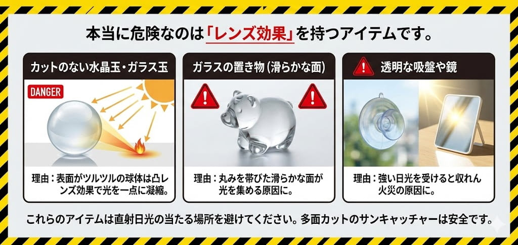 本当に注意すべきなのは、サンキャッチャーと混同されやすい、以下の**「レンズ効果」を持つアイテム**です。