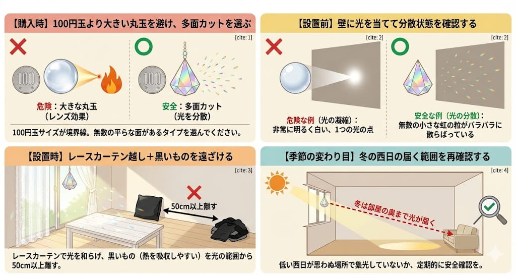 これらのポイントを押さえれば、天然水晶でもスワロフスキーでも、火災の心配なく美しい虹色の光を安心して楽しめます。